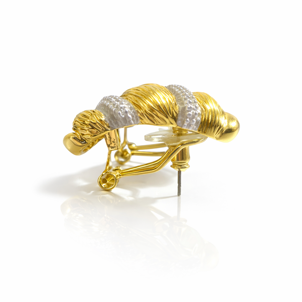 The Aurora Twist Earrings showcase a sophisticated interwoven design that combines glossy gold tones with a sparkling pavé silver band.
