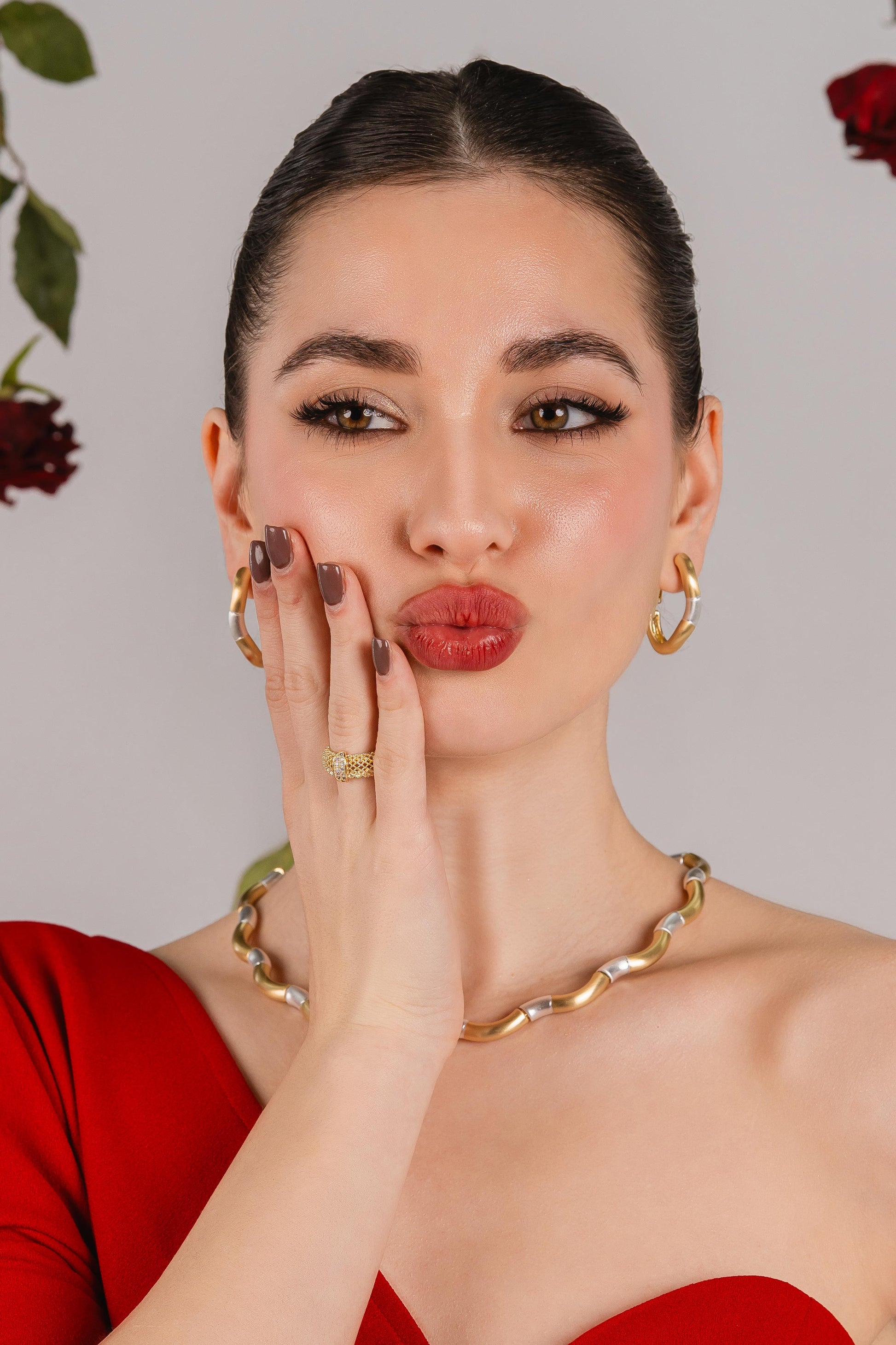 Designed with smooth wave-inspired links, this necklace features a refined interplay of warm gold and sleek silver-tone accents. Its fluid silhouette sits gracefully around the neck, creating a balanced statement that feels both modern and timeless.