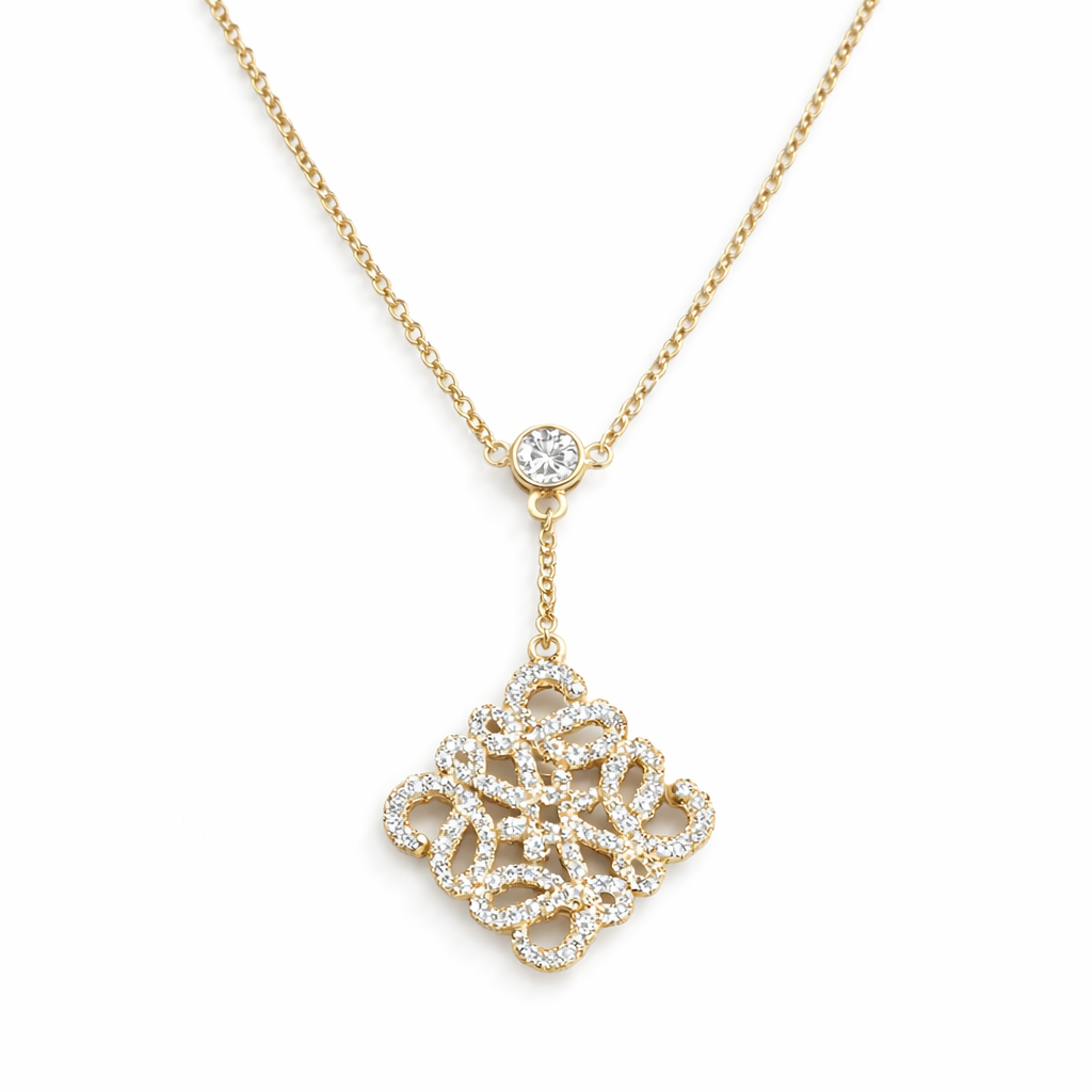 Featuring a delicate Y-shaped chain, the necklace showcases a single center stone leading to an intricate filigree pendant crafted in a geometric lattice design, fully set with shimmering zircon stones. - Lightweight and versatile, it’s perfect for special occasions, minimal evening looks, or adding a touch of elegance to your daily outfits.