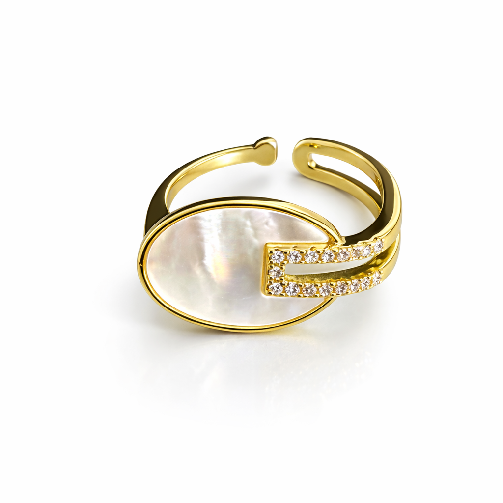 A gold open ring featuring an oval mother-of-pearl stone with delicate crystal accents.